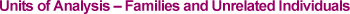 The "unit of analysis” used by the Census Bureau in the process of determining who is in poverty is actually two "units” – families and unrelated individuals. A family is a group of two or more persons related by birth, marriage, or adoption who reside together; all such related persons are considered as members of one family. An unrelated individual is a person 15 years old or older (other than an inmate of an institution) who is not living with any relatives. An unrelated individual may be the only person either living in a housing unit or living in a housing unit in which one or more persons who are not related to the individual in question by birth, marriage, or adoption also live. Poverty thresholds for what have been referred to earlier as one-person units are applied to unrelated individuals. Poverty thresholds for two-person units are applied to two-person families, and so on. The Census Bureau has no short term for the concept "families and/or unrelated individuals.” However, the term "family unit” has been used unofficially to refer to that concept by the poverty guidelines Federal Register notice (since 1978) and by some analysts. "Families and/or unrelated individuals” should not be referred to as "households” because "household” is a separate and distinct concept; as defined by the Census Bureau, a household consists of all the persons who occupy a housing unit, whether they are related to each other or not. A household may thus contain one or more families and/or one or more unrelated individuals; poverty status for each such family and/or unrelated individual is determined separately.